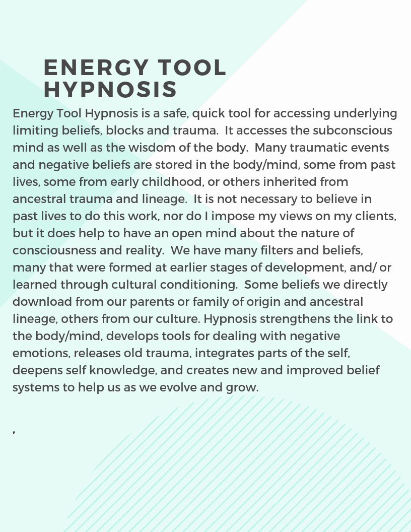 Energy Tool Hypnosis sessions are $50 for 30 minutes. Fast and Powerful.